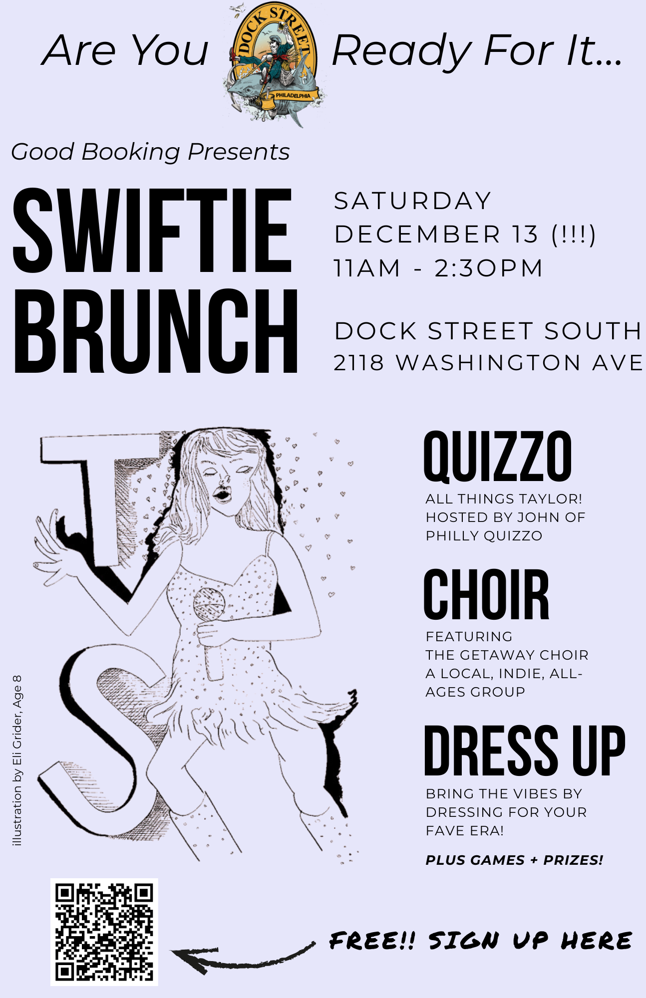 This event is presented by Good Booking. John from Philly Quizzo will be here testing your Swift-thinking abilities, and we’ll have some food and bev specials that would get Ms. Swift’s stamp of approval. Plus, an appearance from the Getaway Choir performing some of her greatest hits.