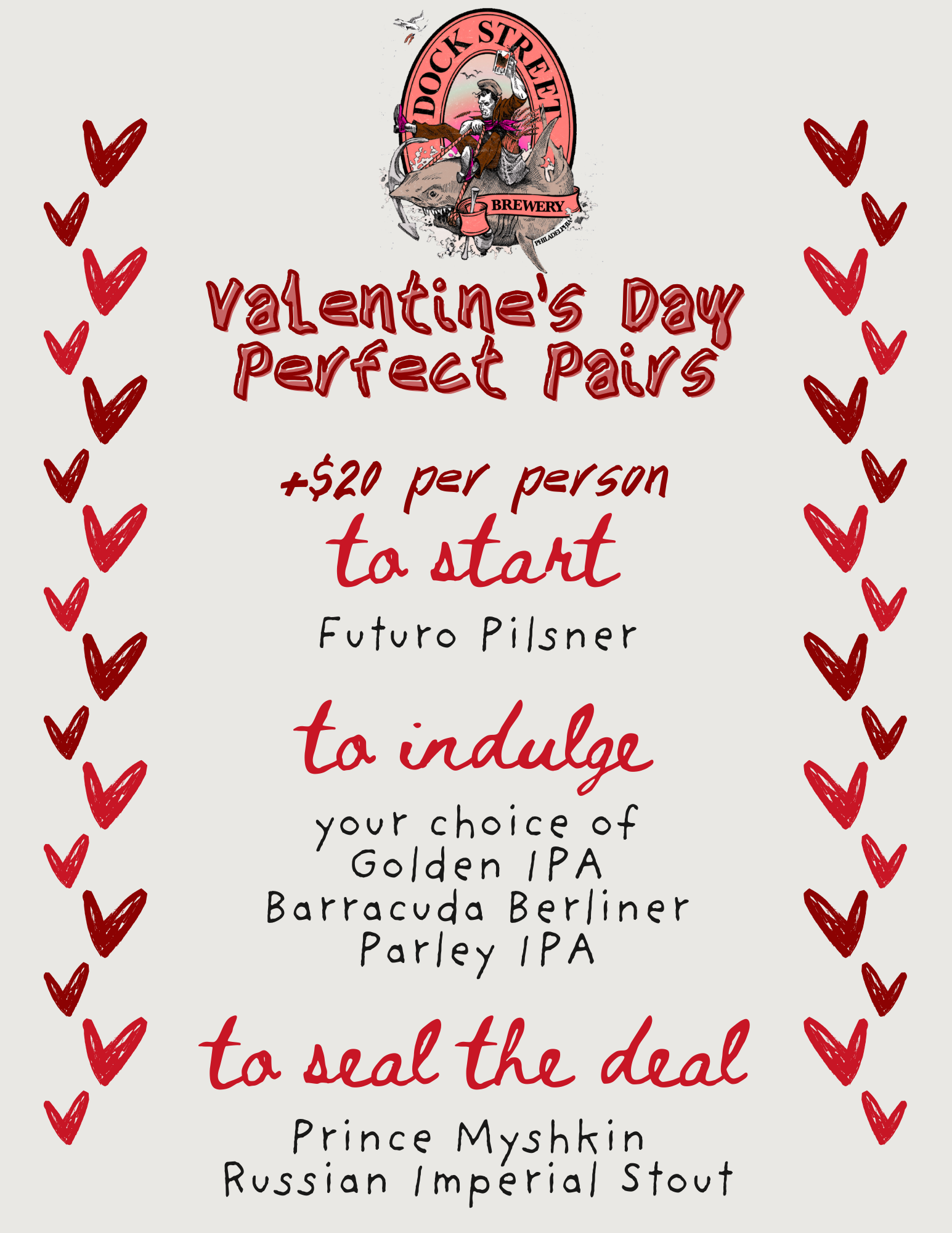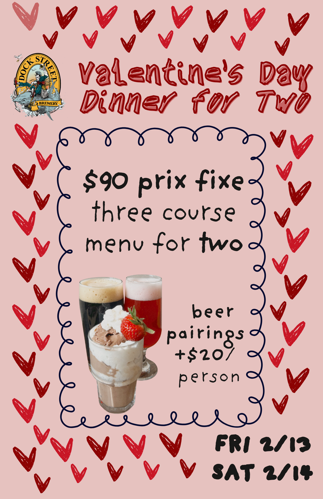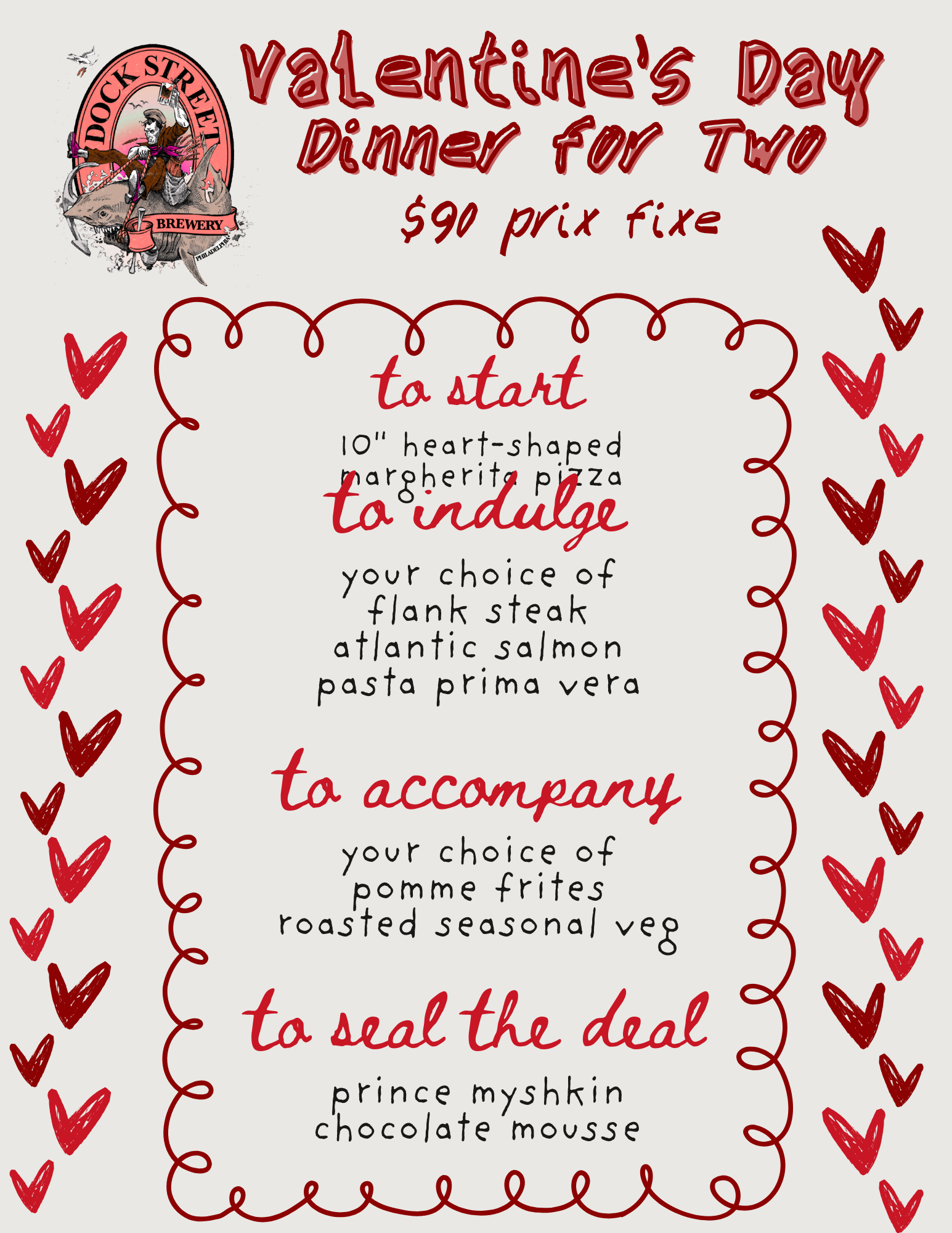 A perfect pizza appetizer (heart shaped, obvi), your choice of classic date night entrees and sides, a decadent chocolate mousse for dessert, with an optional beer pairing with every course— available Friday the 13th and Saturday Feb 14th, AKA Valentine's Day, only.