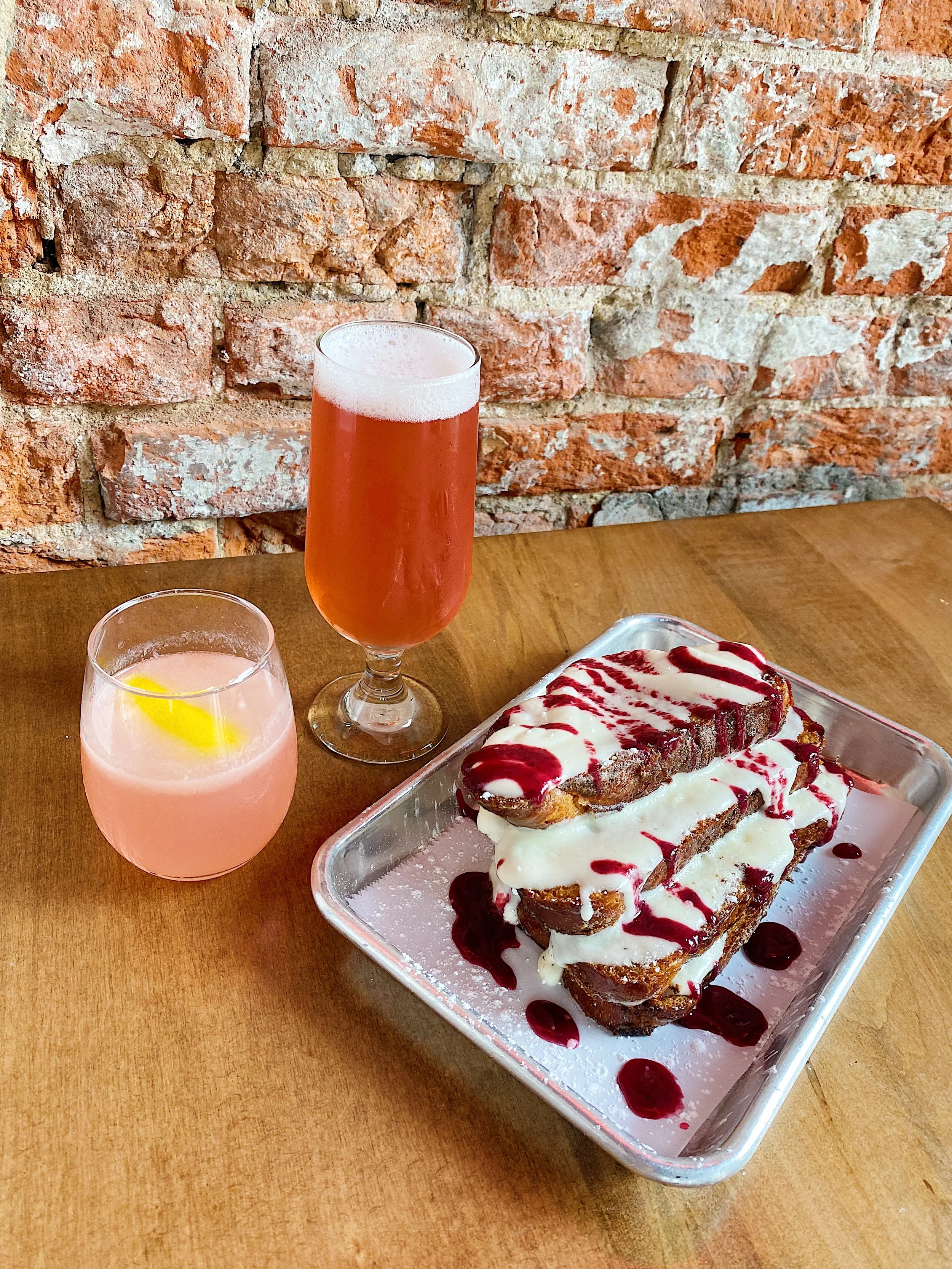 You can’t do salty without sweet at brunch - that’s literally the law, sorry, we don’t make the rules - so wash down your sandwich with a beautiful stack of beer-battered (yes.) Challah French Toast topped with cream cheese stuffing + strawberries.