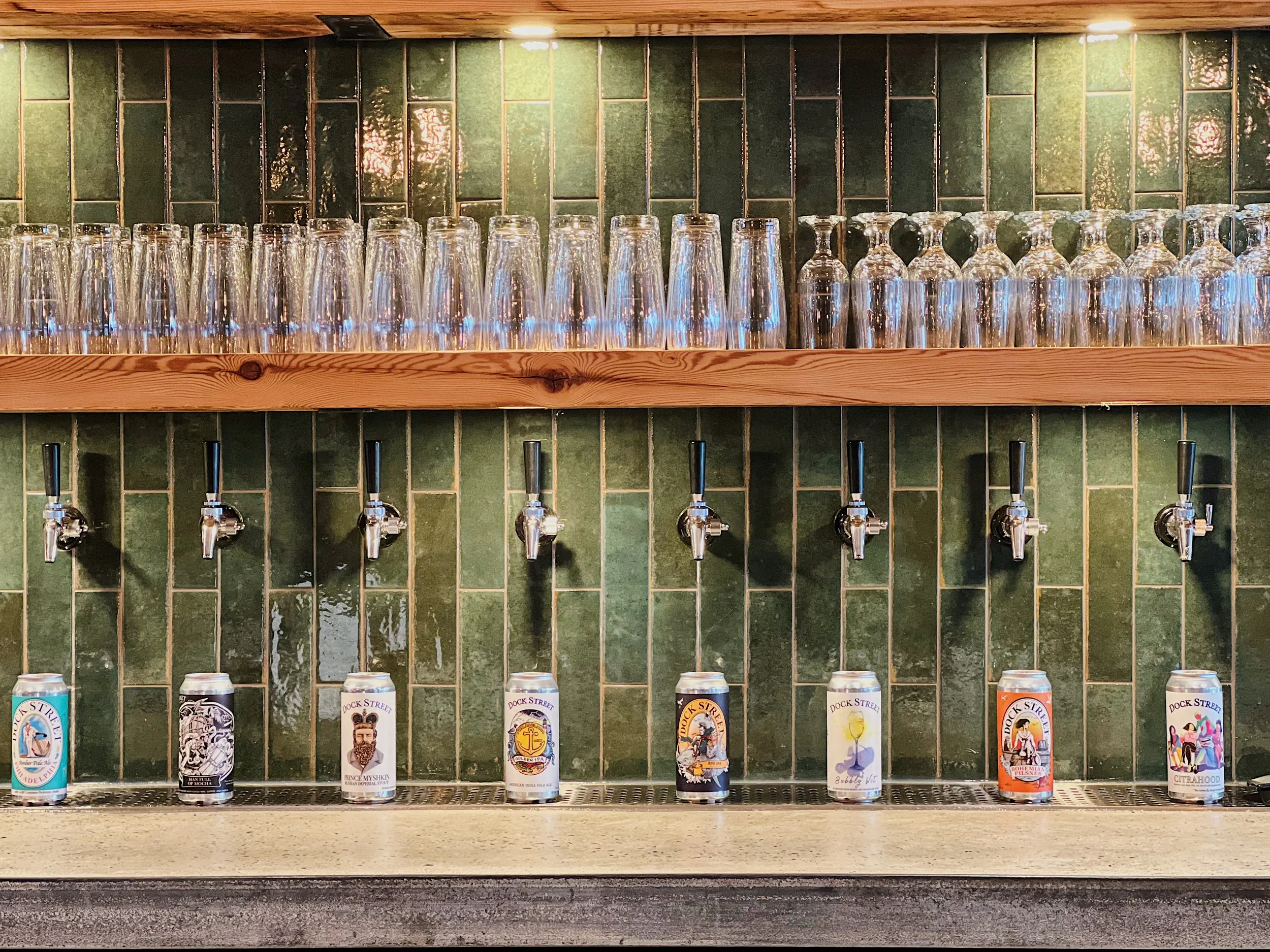 Back to the bar - eight taps feature a rotating selection of Dock Street’s award-winning brews, with an additional four lines for wine and cider. The current line up includes staples such as Dock Street Rye IPA and Dock Street Bohemian Pilsner, and moody seasonals like Dock Street Prince Myshkin and Dock Street Citrahood.