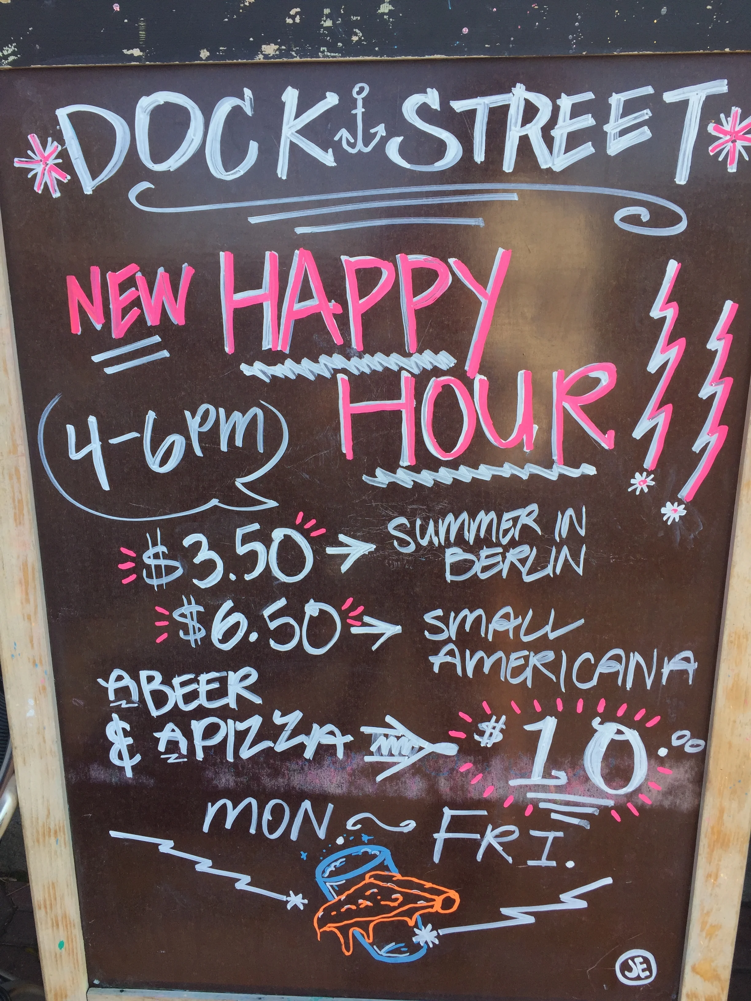 Every Monday through Friday from 4pm - 6pm at Dock Street, you can get acquire a small, wood-fired pizza and it's trusty sidekick, a delicious beer.