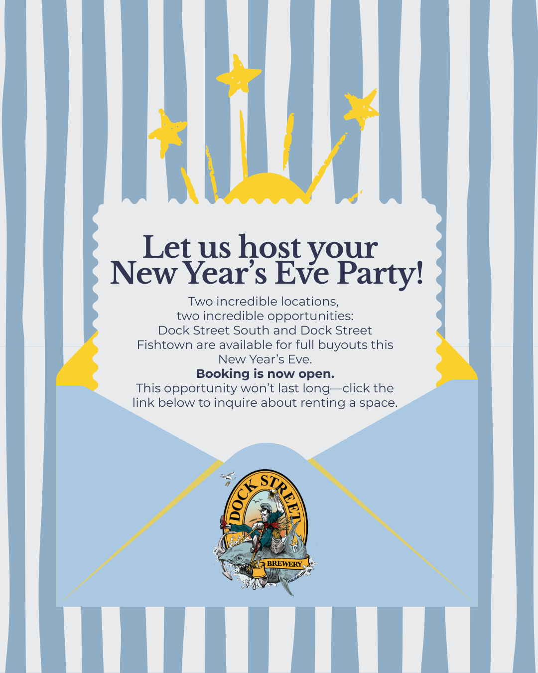 We know that there’s nothing quite like ringing in the New Year at a house party, but how about skipping the cleanup and the BYOB? Adding some extra elbow room to celebrate never hurts - Dock Street South has 10,500 square feet of elbow room, to be exact, with smaller private areas or one large room available, and Dock Street Fishtown has a cozy 1000 square feet.